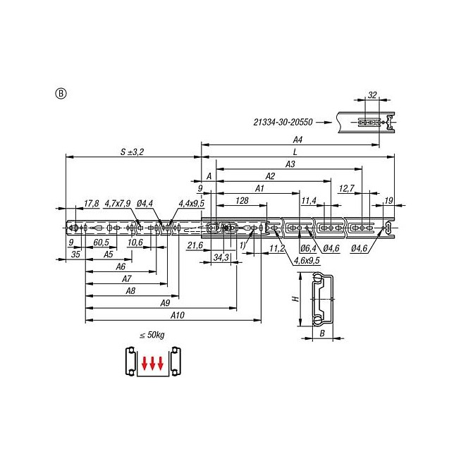 PROWADNICA TELESKOPOWA L=500 12,7X35, ROZKL. NA NIEPELNA DLUGO. S=376, Fp2=34, Fp1=45, FORMA:B, STAL