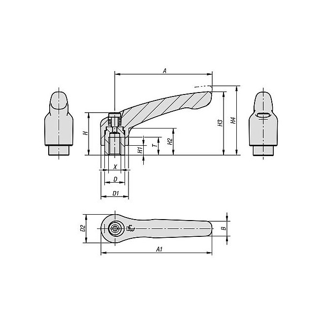 Rękojeści nastawne stalowe, z gwintem wewnętrznym, kolor rubinowy, wstawka gwintowana stalowa oksydowana - inch