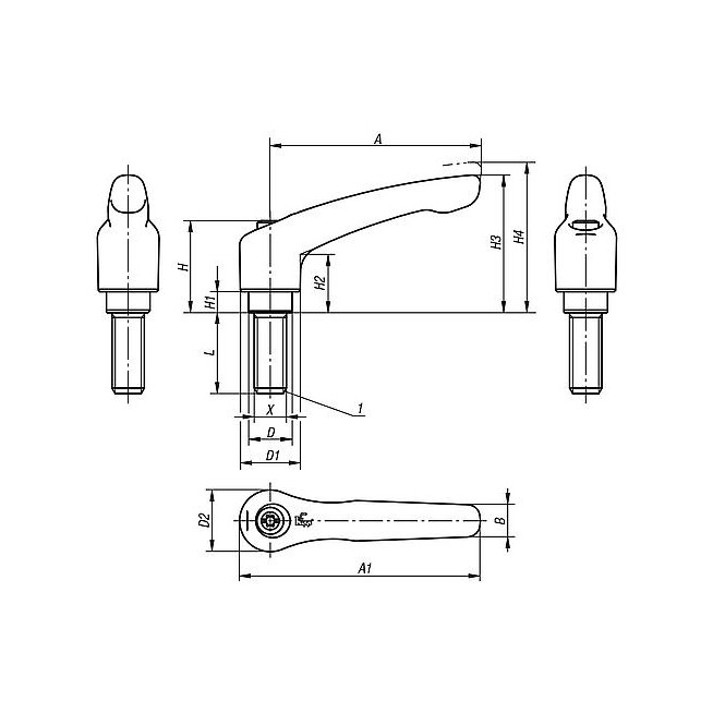 Rękojeści nastawne z cynkowego odlewu ciśnieniowego z gwintem zewnętrznym, wstawka gwintowa stalowa oksydowana - inch