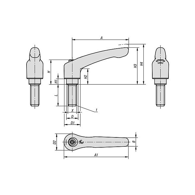 Rękojeści nastawne z gwintem zewnętrznym, części stalowe nierdzewne, matowe strukturalne - inch
