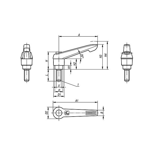 REKOJESC NASTAWNA Z PRZYCISKIEM RO.2 1/4-20X20 TWORZYWO SZTUCZNE, CIEMNOSZARY RAL7021, KOMP:STAL