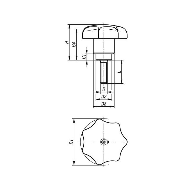 Uchwyty gwiazdowe z tworzywa sztucznego, z funkcją zabezpieczającą, z gwintem zewnętrznym - inch