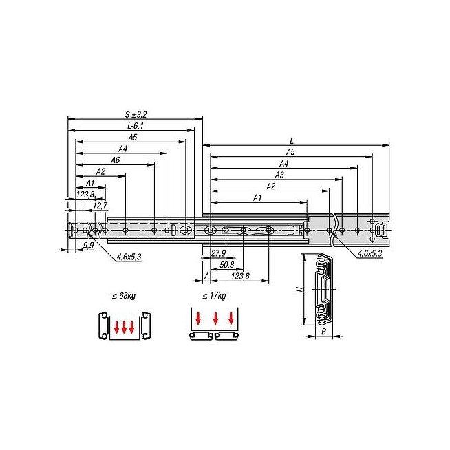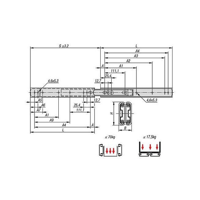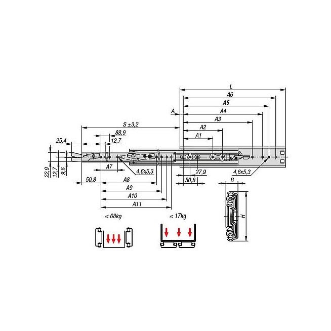 PROWADNICA TELESKOPOWA L=457 12,7X50,8, ROZKLADANE S=483, Fp=66, STAL OCYNKOWANY, MONTAŻ Y BOKU, 1 SZT. = 1