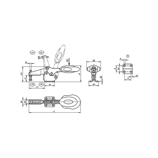 DOCISKACZ POŁOŻENIE POZIOME Z BLOKADĄ, Z PRZYLGA POZIOMA F1=1350, PRZESTAWNĄ ŚRUBĄ DOCISKOW M06X35, STAL NIERDZEWNA
