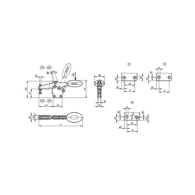 DOCISKACZ POŁOŻENIE POZIOME Z BLOKADĄ, Z PRZYLGA POZIOMA F1=2000, PRZESTAWNĄ ŚRUBĄ DOCISKOW M08X45, STAL NIERDZEWNA