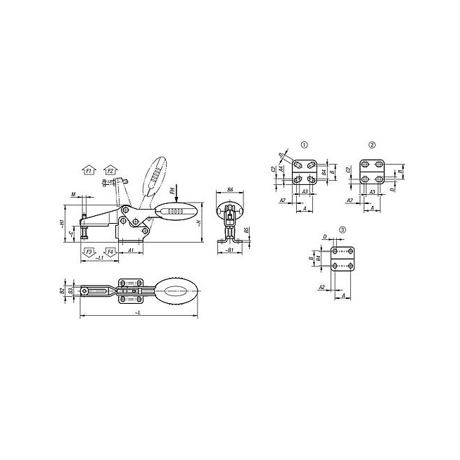 DOCISKACZ POŁOŻENIE POZIOME Z BLOKADĄ, Z PRZYLGA POZIOMA F1=1350, PRZESTAWNĄ ŚRUBĄ DOCISKOW M06X35, STAL