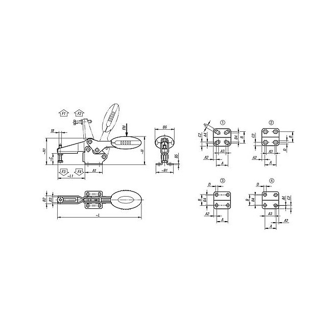 DOCISKACZ POŁOŻENIE POZIOME Z BLOKADĄ, Z PRZYLGA POZIOMA F1=1350, PRZESTAWNĄ ŚRUBĄ DOCISKOW M06X35, STAL