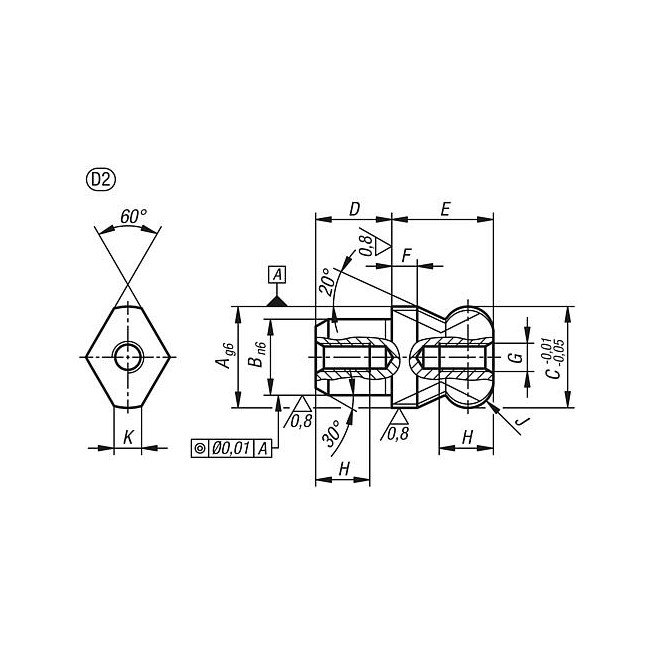 KOLEK INNENGEWINDE BEIDSEITIG RO.2 C=20, A=20, G=M05, FORMA:D ABGESETZT M.KUGELANS.ABGE, STAL NARZEDZIOWA