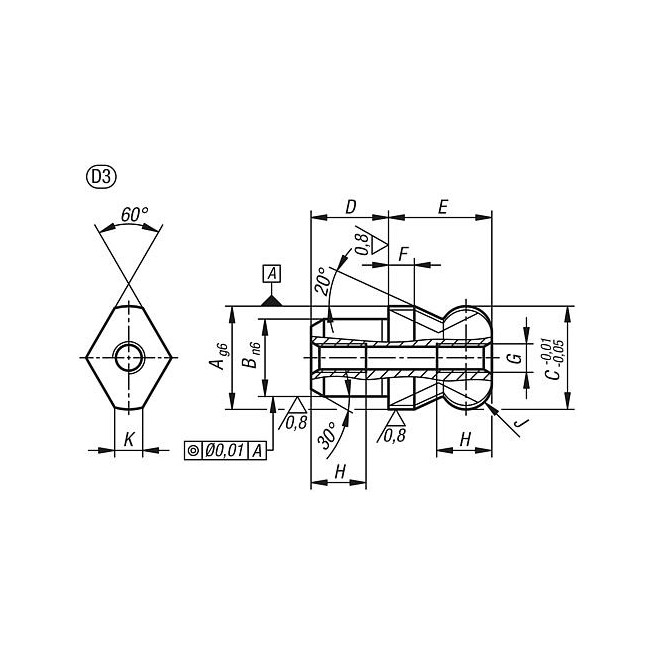 KOLEK INTERNAL THREAD ONE SIDE RO.1 C=20, A=20, G=M05, FORMA:D ABGESETZT M.KUGELANS.ABGE, STAL NIERDZEWNA