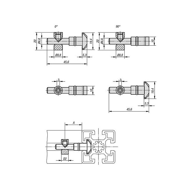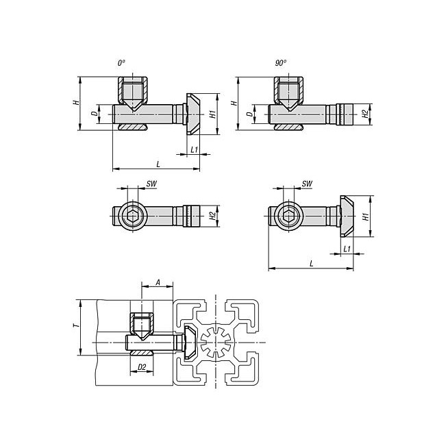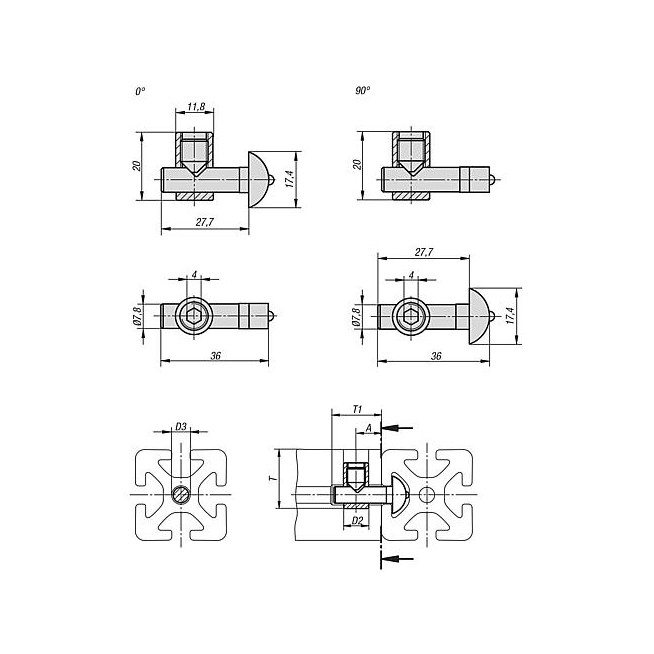 - Pokrętła zaciskowe z zatrzaskiem ze stali z pokrętłem gwiaździstym z tworzywa sztucznego i optycznym oznaczeniem blokady