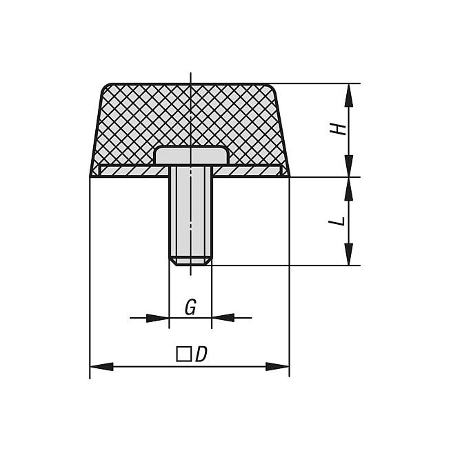 AMORTYZATOR GUMOWY CZWOROKAT GWINT ZEWNĘTRZNY M10X28, D=50, H=20, STAL, OCYNKOWANY, KOMP:ELASTOMER - KAUCZUK